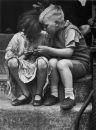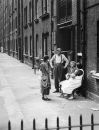 Suschitzky expertly manages to capture intense moments in relationships, whether it be old friends, such as dramatist Sean O’Casey and actor Barry Fitzgerald, welcoming each other warmly after a long absence, whether it be children lost in play or a couple obviously caught in a moment of tension. This picture p. 38 turned out so well because his Rolleiflex camera allowed Suschitzky to shoot at any angle without people noticing they were being photographed. When exactly this intimate scene was taken (the photographer has variously dated it 1934, 1936 and 1941) is not as important as the story it tells: “The central focus of interest in the picture is a young woman who rests her elbows firmly on the table and gazes at her companion with a stare which is both interrogative and affectionate. Her male partner leans across the table in a pose which is both supplicating and emphatic. Around the couple the other diners are shadowy figures; one can make out a head here, a profile there. It is a beguiling and mysterious photograph of a small human drama.” (Val Williams) Sometimes it is the past and the present that enter into dialogue, with everyday scenes unexpectedly turning into whimsical historical documents. Who, for instance, is still aware today that grazing sheep were once employed to look after Hyde Park’s well-kept lawns? Long gone, too, are the streets of Stepney tenements, where Suschitzky managed to capture the lost world of an intact community with residents meeting in the street for a neighbourly chat.